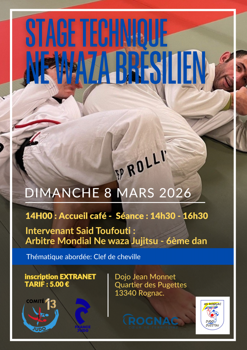 Le Comité vous invite à participer, le 8 mars prochain, à un STAGE TECHNIQUE NE WAZA BRESILIEN à ROGNAC.